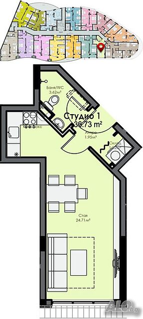 Find Property offers for sale a small, compact apartment in the Lazur residential complex, in close proximity to the Russian Gymnasium.